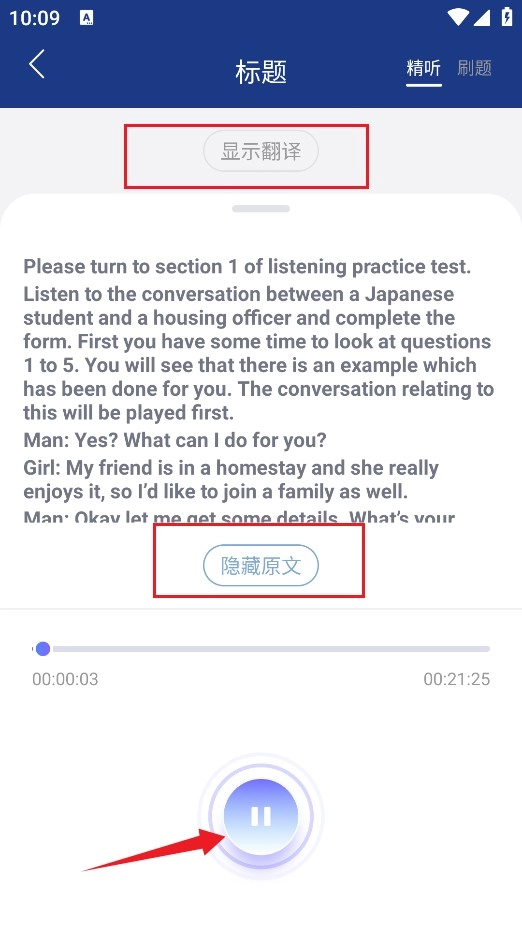 如图所示,在此处能够开启或关闭翻译内容,还可以隐藏和显示原文。点击底部的播放按钮,就能控制听力的进度。