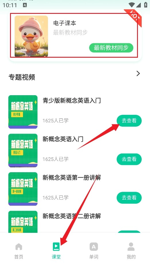 【课堂】界面包含专题视频资源和电子课本,点击“查看”即可浏览课程详情。