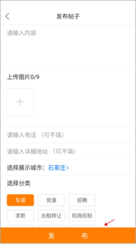 先输入需要发布的信息内容,再上传照片,接着选择合适的发帖类别,最后点击页面下方的“发布”按钮,这样信息就成功发布出去了。