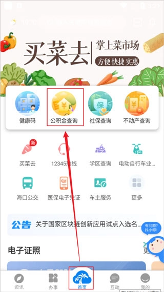 首先,打开椰城市民云应用,在界面点击底部的“首页”选项,接着点击页面上方的“公积金查询”功能入口。