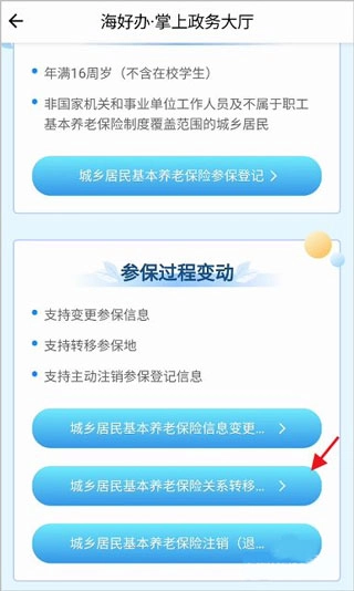 打开掌上政务大厅,找到下方的“城乡居民基本养老保险关系转移”选项,点击进入该功能页面。