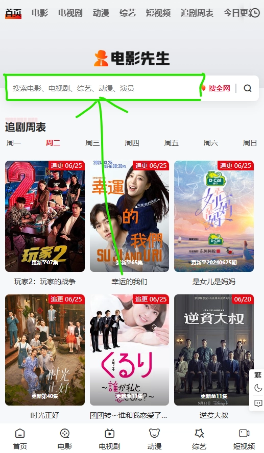 打开电影先生,点击最上方的搜索框