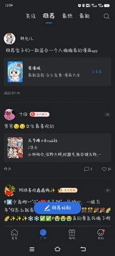 3、进入“广场”页面,能看到其他星夜影视用户推荐的优质剧集,还能与关注的好友互动交流,包括点赞、评论等操作。