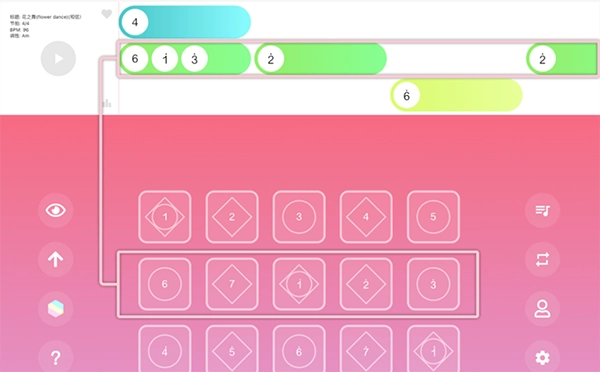 点击歌曲标题后稍作等待,乐谱便会加载至练习界面。乐谱共分为三行,其中第一行与键盘的第一行按钮相对应。