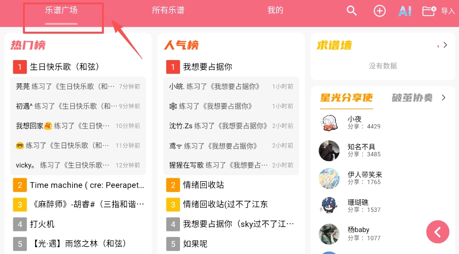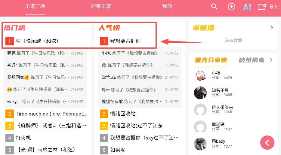 在热门榜和人气板块,你可以了解到其他玩家近期在练习的热门曲目,这能为你自己的练习选曲提供参考。