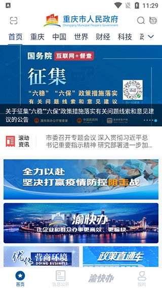 重庆市政府App是由重庆市政府打造的政务办公类应用,平台每日实时推送最新热点新闻,第一时间更新城市动态信息,助力重庆市的建设发展进程。热衷于获取各类资讯的用户不妨体验一下这款软件,无需出门就能便捷办理行政审批、公共服务、法人办事、个人办事等多种生活服务事项。