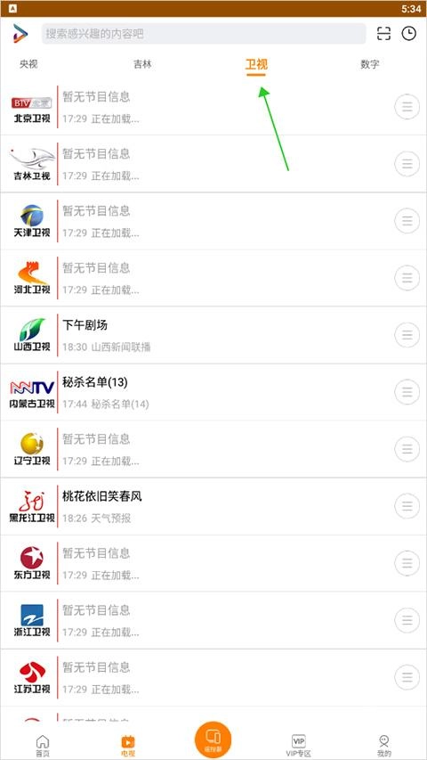 3、还能将顶部导航栏切换到【卫视】板块,观看其他省市卫视的电视直播