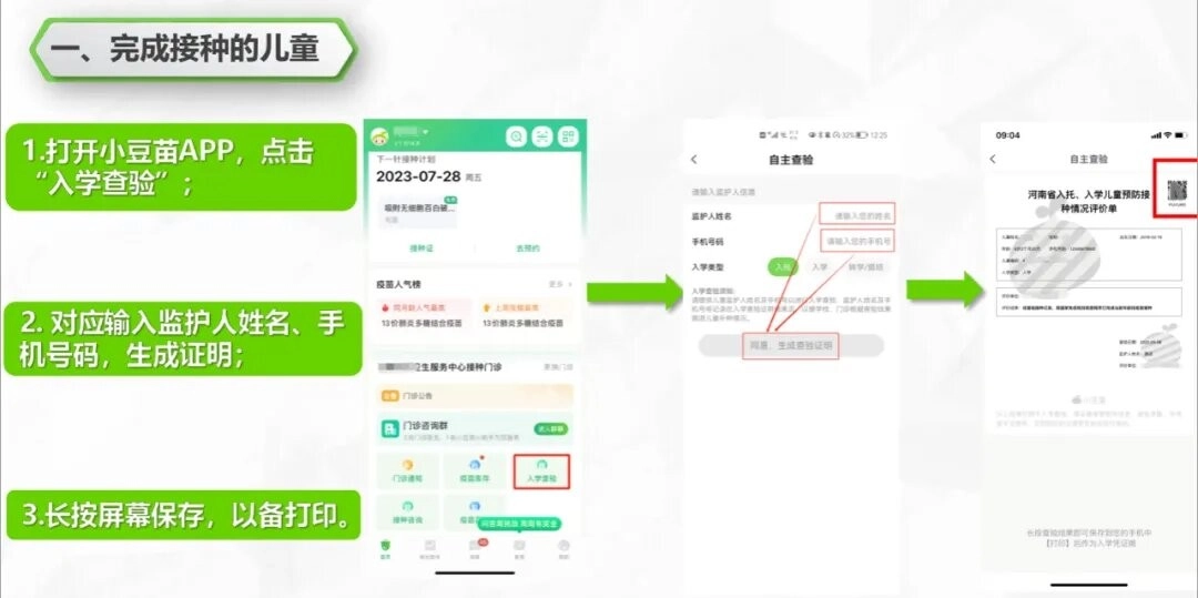 已按儿童所处年龄段完成相关免疫程序的,家长可直接通过“小豆苗”进行线上查验,获取查验证明后自行打印。