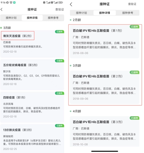 从“接种详情”中查看含“灭活”的脊灰接种记录或者五联疫苗接种记录,凡不足2剂次的均需参与此次补种工作。(下图为不需补种者案例)