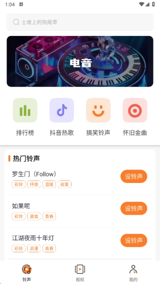 首页设有排行榜、抖音热歌、搞笑铃声、怀旧金曲等版块,同时也包含各类热门铃声。