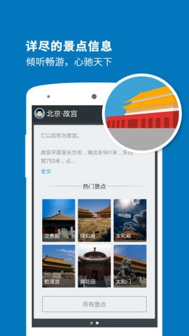 故宫导游为游客打造了全新的游览体验。它把智能语音讲解和丰富的旅游资源信息巧妙结合,既提供详细的景点介绍,又贴心地包含导航与门票信息。这款应用致力于让每位游客都能轻松游览故宫,就像身边有位经验丰富的导游陪同。欢迎访问本站,开启您的智能故宫之旅!