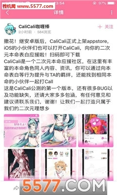 CaliCali是一个能和小伙伴们一起,为自己的二次元本命角色应援的社区。在这里,你能找到本命角色最丰富的同人内容与资讯;可以向本命角色大胆表白,不断提升和TA之间的羁绊;还能结识拥有相同本命的其他小伙伴,一同为TA应援打call。让我们携手,打造专属于我们的二次元理想乡吧。