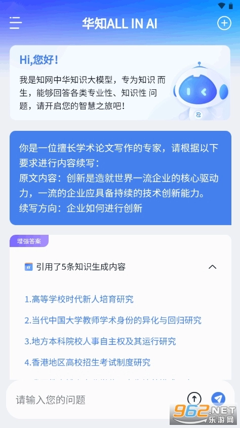 华知是同方知网与华为云携手共建的智能知识服务平台,融合了华知大模型的强劲能力。这个应用除了具备智能写作、学术搜问、AI伴读等基础服务外,还新添了智能PPT、AI科技查新、3D全息交互数字人等新颖功能。华知专注于为用户供给定制化、生成式的专业知识服务,涵盖教育、科研、政务决策、医疗健康等诸多领域,帮助用户更高效地获取和运用知识信息。
