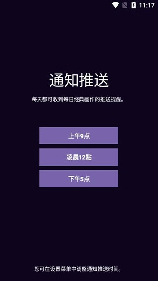 接下来你可以设置每日推送提醒的时间,选择早上或者晚上都可以,看画作的习惯由你决定。