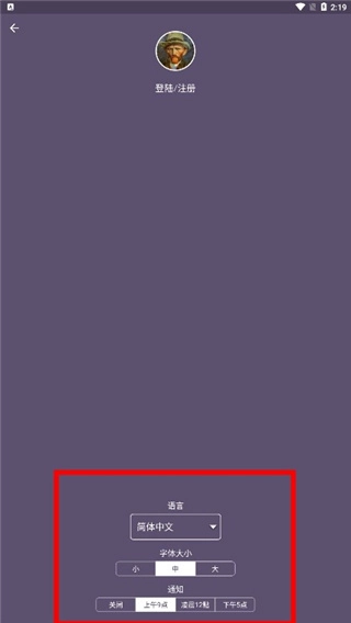 若用户初始进入时未选择语言,在此处仍可进行语言选择,同时还能设置字体大小、通知时间等相关选项。