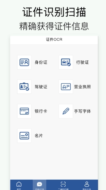 证件识别功能可对身份证、驾驶证、银行卡、名片等各类证件进行高精度扫描,通过拍照扫描的方式,完整提取其中的文字信息。