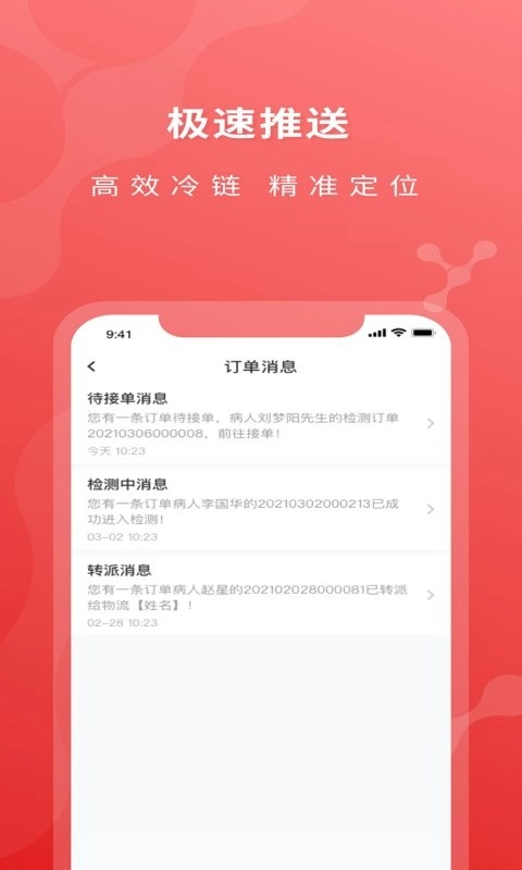 系统会自动推送订单信息,方便您随时了解订单状态,一旦出现异常情况会及时通知;主页面清晰划分待接单、已接单、已完成三大板块,医院、医生、患者等各类数据信息,都能在平台内直观呈现,一目了然。