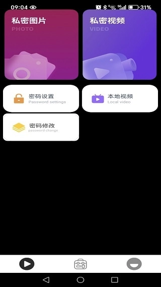 安装完成后,首页会呈现丰富多样的功能,其中包括私密照片与视频的查看功能,同时还提供密码设置以及本地视频导入服务。