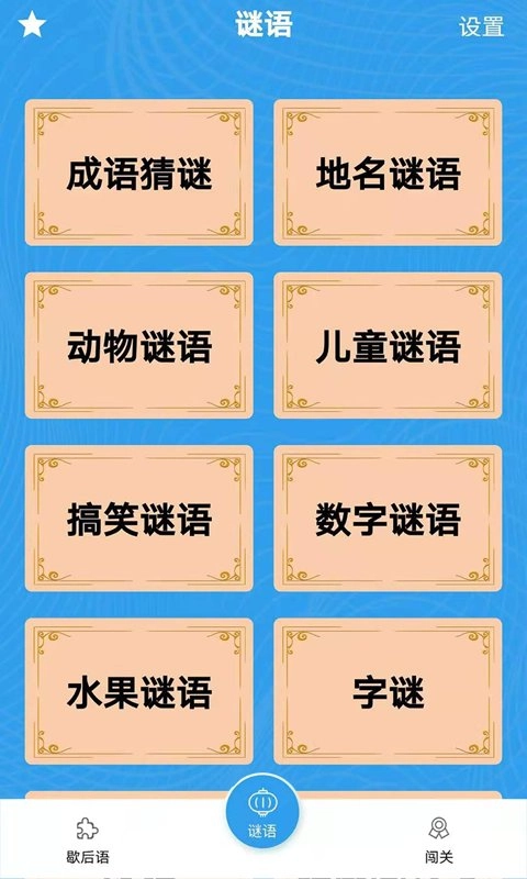 普通事物、动物、搞笑、谐音、日常、三国、经典和有趣的歇后语挑战,用户可以根据自己的喜好选择不同的歇后语挑战