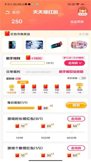 还可以通过签到、完成任务来领取金币获取红包;