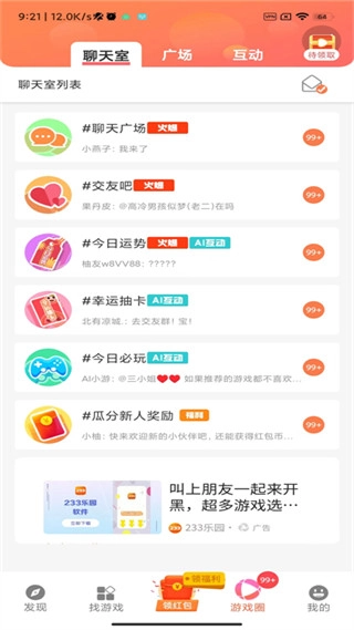 安装完成柚子小游戏的最新版本后启动软件,界面上会呈现出发现、找游戏、领红包、游戏圈和我的这五个板块。