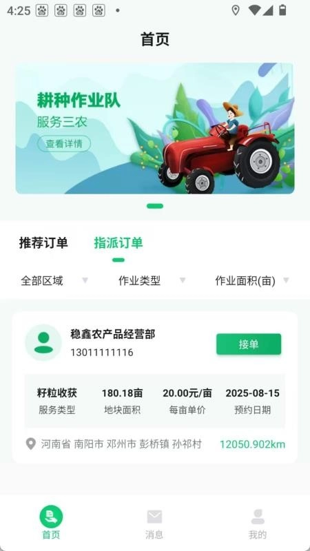 完成农机手认证后,你可以实时在线查看订单动态,还能第一时间承接平台指派的订单。