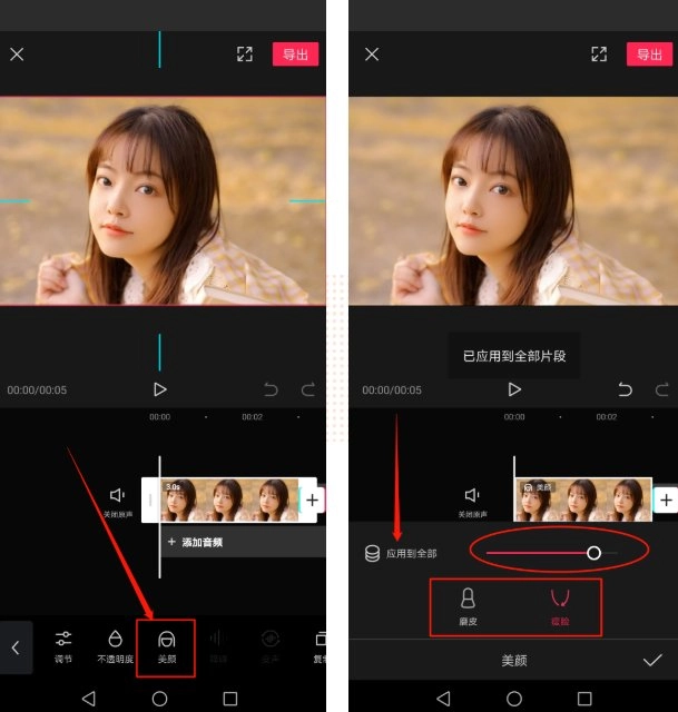 作为剪映的基础功能之一,美颜功能涵盖了人像的磨皮与瘦脸效果。导入素材后,选中对应的视频条,接着滑动下方的工具栏,在靠后的位置便能找到“美颜”按钮,通过它可以对美颜效果进行调整。此外,点击“应用到全部”选项,这样就能完成所有人像视频的美颜处理了。