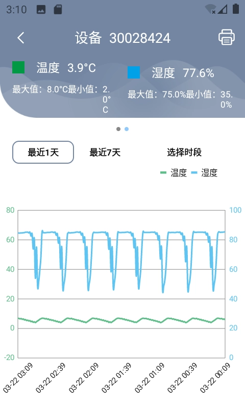 登录用户可查询下属监控设备的相关信息,包括设备的实时监控数据及其数据曲线;还能借助蓝牙打印机,打印出某一时间段内的监控数据;同时支持查询新设备的报警数据。该功能可对冷链设备的温湿度数据进行实时监控,助力冷链设备运转管理,保障实现24小时不间断实时监控,让管理过程更省时、省力、省心。