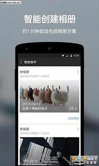 助手会依据照片的拍摄时间、地点等信息,在30至100秒内自动生成照片分组方案,您可以用这些方案为照片新建相册,也能将照片添加到已有的相册中。【超大云空间 足够你存储你所有的照片】