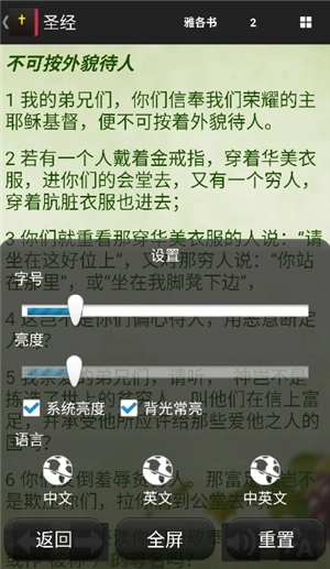 也可以对语言、字号、亮度和全屏模式进行设置,为你带来更优质的圣经阅读体验