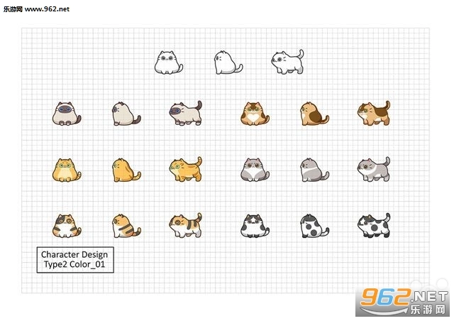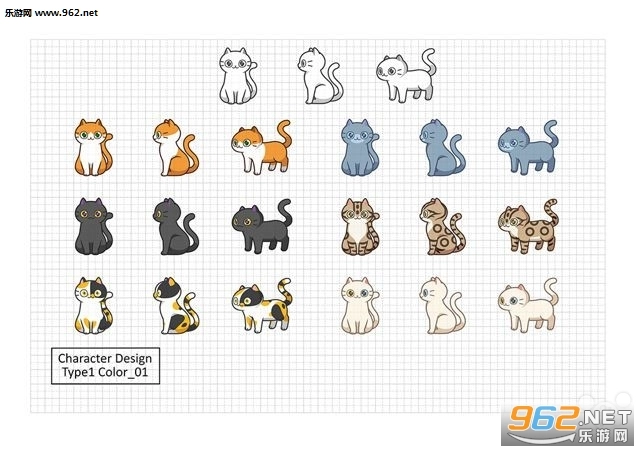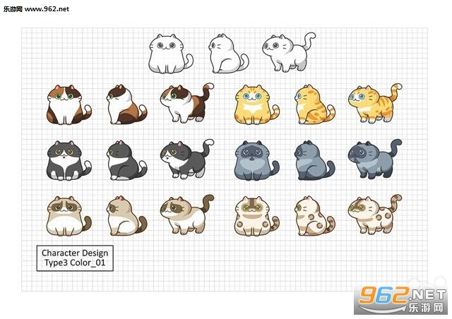 玩法这般丰富,要是没有可爱的猫咪岂不是可惜了?所以游戏开发商在游戏第一季采用了如下角色配色方案,每种体型搭配六个颜色,总共有十八种猫咪,颜色设计主要依据现实中存在的猫色,并且在此基础上进行了图案化处理。