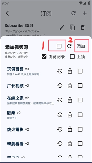 4、点击【订阅】,右上角【+】,粘贴订阅源。