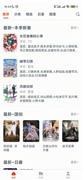 2、分类页面简洁,分为日漫、国漫、剧场等,还有更新、热门、评分、最新、推荐等选项。