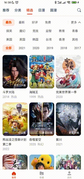 3、精选页面分类详细,包括冒险、剧情、科幻、热血等动漫类型,及属地、年份分类。