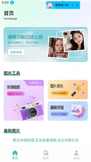 1、启动Fansly相机应用程序进入主页面,运用美颜相机、图片美化、趣味拼图等功能。