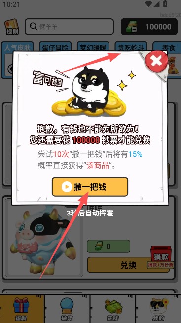 3、兑换时根据提示等待3秒钟后花费等额钞票或直接观看广告获得兑换资格。
