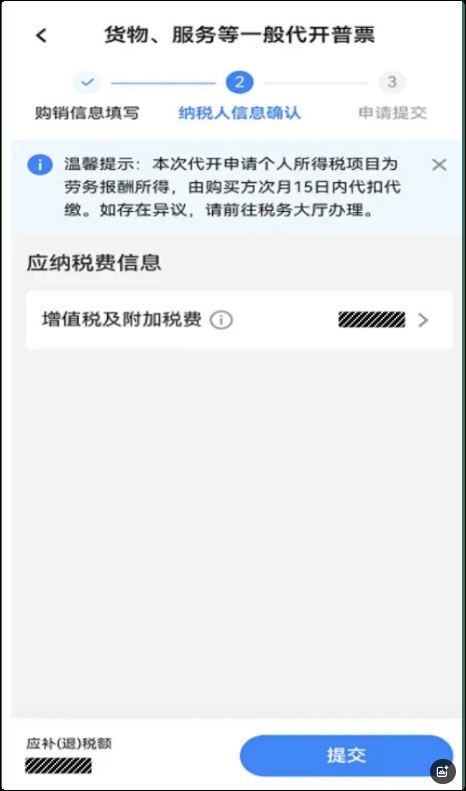 纳税人信息确认界面温馨提示:当本次代开申请的个人所得税项目属于劳务报酬、稿酬或特许权使用费所得时,相关税款需由购买方在次月15日内履行代扣代缴义务;若对此存在异议,可前往税务大厅办理相关事宜。