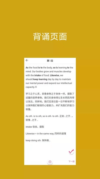 背啊英语软件,哪里不会就点哪里。点读、翻译功能样样俱全!更有独特的背诵功能,助力快速记忆,还能进行自测练习!