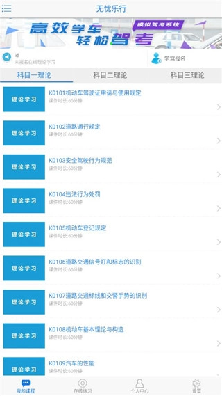 打开软件后,能看到科目一到科目三的理论课程可供自由学习,其中涵盖了所有考试知识点,并且是以视频形式呈现的免费教学内容。