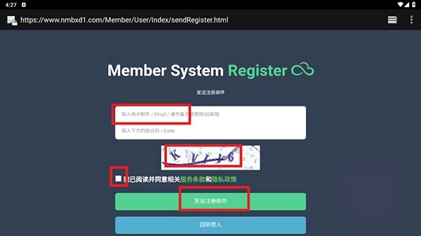 3、输入邮箱地址和验证码,点击发送注册邮件。