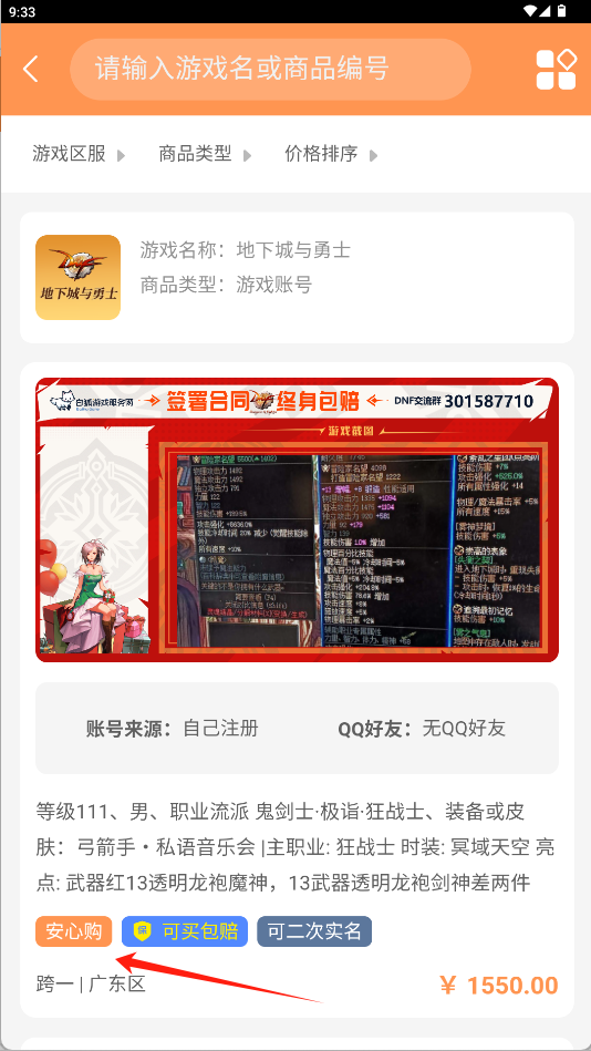3、进入商品详情页查看账号属性、保障条款及价格,确认后即可购买。