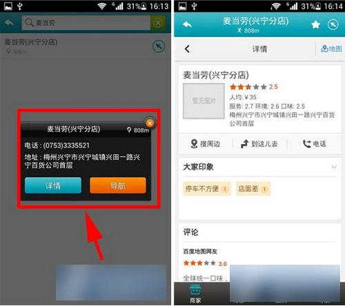 点击后,会出现【详情】和【导航】两个选项。点击【详情】,不仅能查看店铺简介与网友评价,还可以领取蝴蝶礼包、参与团购活动。(见下图)
