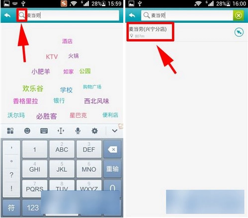 讲完上述【眼睛标志】的使用方法后,接下来我们介绍该应用的搜索功能。操作步骤如下:首先进入搜索界面,输入想要查找的关键词(本文中手机世界小编以某快餐店作为示例),接着点击搜索按钮,之后在搜索结果里找到并点击自己所需的内容。(见下图)