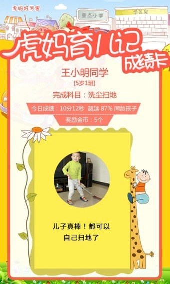 当孩子出色完成某项家务技能或生活习惯训练任务时,我们可以把孩子的照片、任务完成情况以及获得的奖励金币整合起来,制作成精美的“成长记录卡”。家长可以第一时间将这张卡片分享到微信朋友圈、QQ空间,向家人和朋友们展示孩子的成长进步。