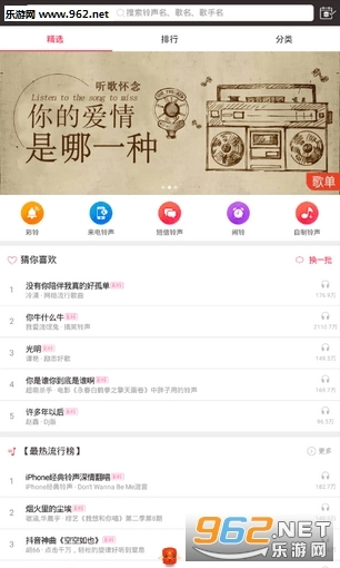 【铃声丰富到随心选】严选500万首高品质热门铃声,每一首都是经典之作,每一首都备受追捧。热播剧集里的插曲铃声、网络上爆火的搞笑铃声、人气歌手的单曲铃声……你所期待的各类铃声,酷音铃声全都能满足你!
