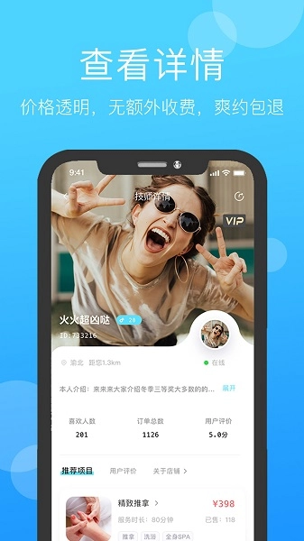 支持按摩推拿、减压SPA、足疗足浴等服务选项,支持技师人员信息查看,帮助随时缓解身心疲劳;
