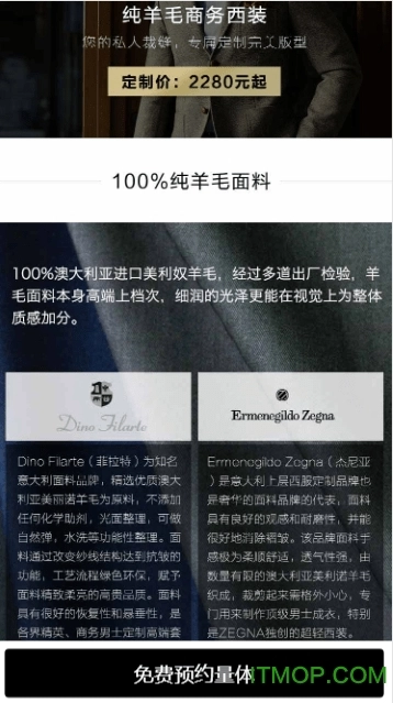 服装,价格比传统高定店低很多。客户只需一键免费预约,专业着装顾问就会上门进行一对一量体,采集24项身体数据。依托公司专利的3D量体演示技术,客户能够随选随看还原度超高的效果图,以此辅助当面挑选面料和款式。 对全球各类顶级面料进行精挑细选,始终选用澳大利亚美丽奴羊毛等国际知名面料,提供超1000种进口面料与百余款国产全毛面料供客户挑选,还有上千款工艺精湛的辅料为西装增添光彩。详细信息