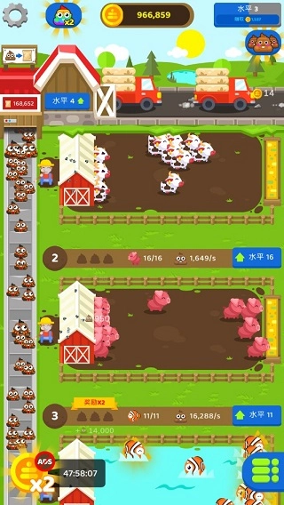 - 拓展你的业务版图,赚取财富,还能用粪便和排泄物来制作肥料,一步步成为放置农场界的大亨,最终晋身亿万富翁行列。