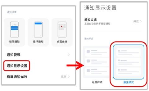 请注意:使用小米MIUI系统的手机,需进入系统设置,找到【通知管理】选项,再进入【通知显示设置】,将通知样式调整为【原生样式】。