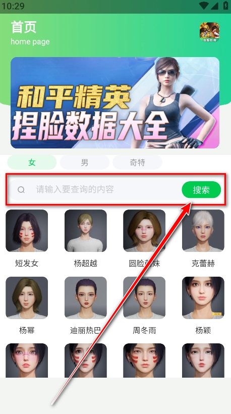1.安装最新版和平精英捏脸盒子App,打开后可见男、女、奇特三大分类;